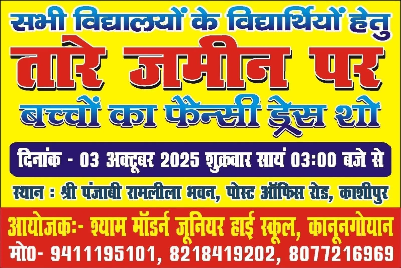 काशीपुर। काशीपुर के बच्चों के लिए भारतीय संस्कृति , सनातन धर्म एवं देशप्रेम पर आधारित प्रतिवर्ष आयोजित किया जाने बाला फैंसी ड्रेस शो शुक्रवार 3 अक्टूबर 2025 को सायं 3 बजे से श्री रामा कृष्णा ड्रामेटिक क्लब ( पंजाबी रामलीला भवन ) पोस्ट ऑफिस रोड काशीपुर में सम्पन्न होगा । तारे जमीन पर फैंसी ड्रेस शो के इस कार्यक्रम में सम्पूर्ण काशीपुर एवं आसपास के सभी विद्यालयों के विद्यार्थी प्रतिभाग कर सकते हैं । कार्यक्रम का आयोजन श्याम मॉडर्न जूनियर हाई स्कूल , कानूनगोयान काशीपुर द्वारा किया जा रहा है साथ ही कार्यक्रम में सम्पूर्ण काशीपुर एवं आसपास के बच्चों को मंच हेतु उपलब्ध कराने के लिए मान्यता प्राप्त विद्यालय प्रबंधक संघ , काशीपुर का विशेष सहयोग रहेगा ।