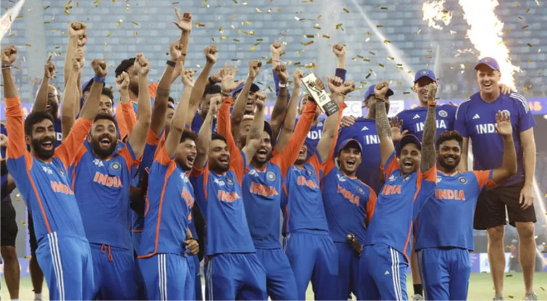 नई दिल्ली। भारत ने पाकिस्तान को पांच विकेट से हराकर रिकॉर्ड नौवीं बार एशिया कप का खिताब अपने नाम कर लिया। टॉस जीतकर भारत ने पहले गेंदबाज़ी का फैसला किया। कुलदीप यादव की शानदार गेंदबाजी की बदौलत पाकिस्तान की पूरी टीम 19.1 ओवर में केवल 146 रन पर सिमट गई। लक्ष्य का पीछा करते हुए भारत ने 19.4 ओवर में पांच विकेट खोकर 150 रन बनाकर मैच जीत लिया। तिलक वर्मा ने जुझारू पारी खेलते हुए 53 गेंदों पर तीन चौकों और चार छक्कों की मदद से नाबाद 69 रन बनाए। जीत दिलाने वाला चौका रिंकू सिंह ने लगाया। रिंकू का चौका लगते ही भारतीय ड्रेसिंग रूम और मैदान में मौजूद दर्शक खुशी से झूम उठे। मुख्य कोच गौतम गंभीर भी अपना उत्साह छुपा नहीं सके। तिलक ने बल्ला लहराकर जश्न मनाया, जबकि पाकिस्तान के खिलाड़ी मायूस नजर आए।