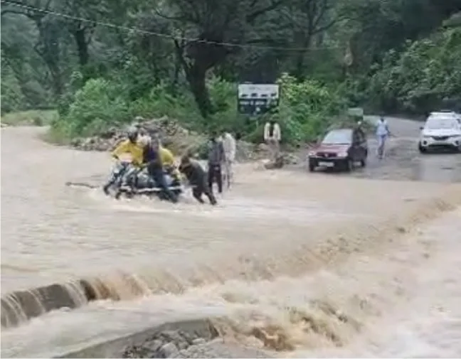 रामनगर का पन्याली नाला उफान पर, एक बाइक सवार बाल-बाल बहने से बचा